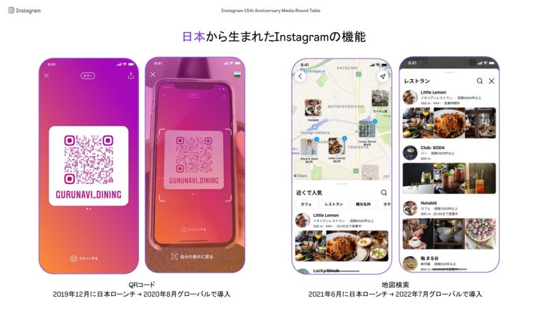 日本はInstagramにとっては重要な市場で、2019年には当時日本に設置していたプロダクトエンジニアリングチームが開発したQRコードを発表している。また、検索利用が多く、旅行やレストラン情報などを地図上で検索できるシステムも日本から始まった。