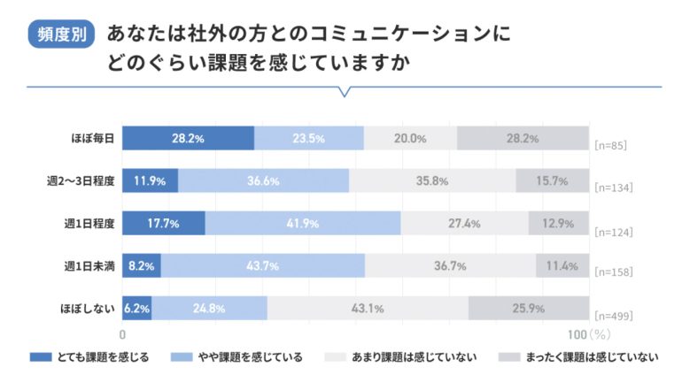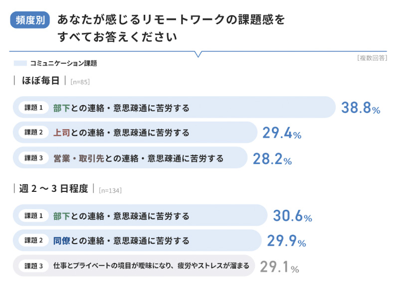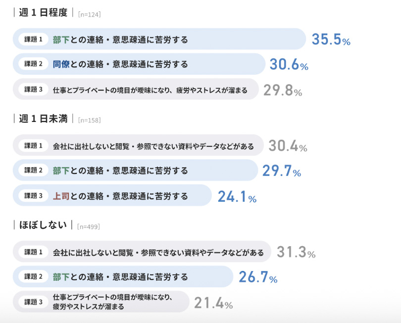 リモートの課題感について調べたところ、リモート勤務の頻度が高い層ほど、コミュニケーションの課題を強く感じる傾向があることがわかった。特に「ほぼ毎日」リモートワークを行う人では、上位3項目がすべてコミュニケーションに関する課題となっている。