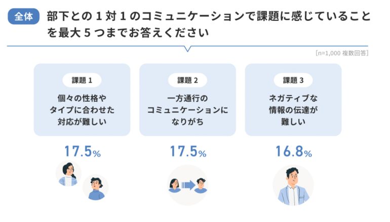 「部下との1対1のコミュニケーションで課題に感じていること」について尋ねたところ、「個々人の性格やタイプに合わせた対応が難しい」「一方通行のコミュニケーションになりがち」(各17.5%)が最多で、次いで「ネガティブな情報伝達が難しい」(16.8%)となった。