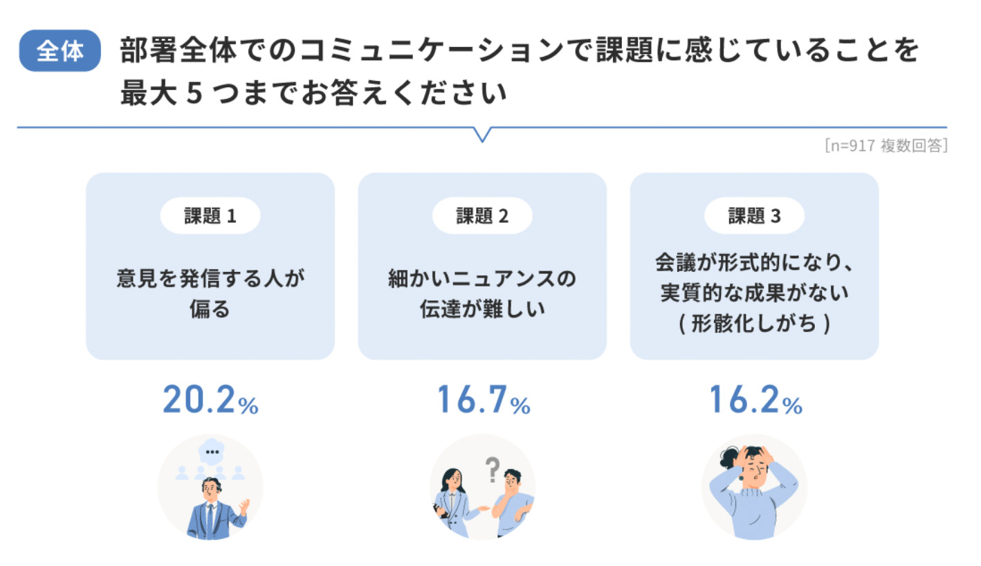 「部署全体でのコミュニケーションで課題を感じていること」について尋ねたところ、「意見を発信する人が偏る」(20.2%)が最多となり、以下「細かいニュアンスの伝達が難しい」(16.7%)、「会議が形式的になり、実質的な成果がない」(16.2%)と続いた。