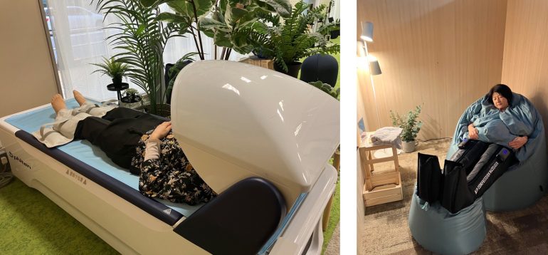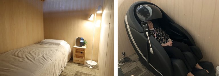 プロのトレーナーが常駐しているので、自宅でもできる簡単なストレッチ指導を受けられるほか、運動、休養に関する相談もできる。他にも、ベッドに横たわり仮眠をとることも出来るし、マッサージチェア、ウォーターウェーブベッドなども使用可能。フットマッサージ機を使用しながらおしゃべりをしたり、一息つけたりするテーブルも。短い時間でリフレッシュできる機能がギュッと詰まっている印象