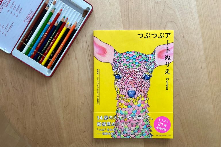 〝つぶ〟をぬってゆく「つぶつぶアート」を、子どもも大人も楽しめる〝ぬりえ〟にすることは夢のひとつだった、とConocaさん。12歳のときに美術家の登竜門「昭和会展」で特別賞を受賞したタイミングで、近しい編集者へその夢をはっきり告げたそうだ。