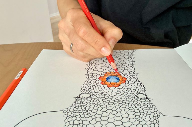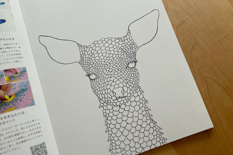 小さなの〝つぶ〟をひとつひとつ丁寧にぬり重ねることで、21種類の愛らしい動物やめずらしい生き物が、いきいきと輝き出す、新感覚のアート体験。モチーフは非常に細かいが、ぬること自体はやさしい。色鉛筆さえあれば、いつでもどこでも心癒されるひとときが楽しめると、多くの人を魅了しているのだ。