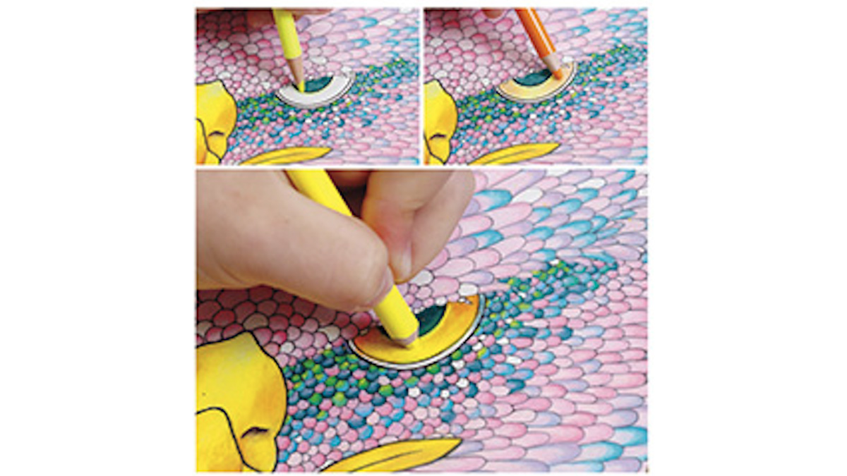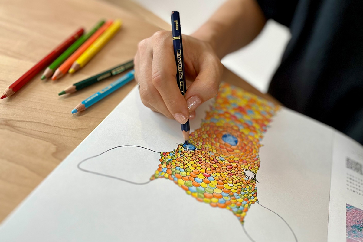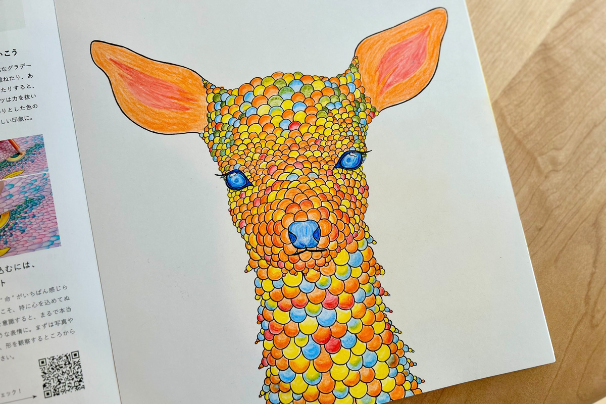 小さなの〝つぶ〟をひとつひとつ丁寧にぬり重ねることで、21種類の愛らしい動物やめずらしい生き物が、いきいきと輝き出す、新感覚のアート体験。モチーフは非常に細かいが、ぬること自体はやさしい。色鉛筆さえあれば、いつでもどこでも心癒されるひとときが楽しめると、多くの人を魅了しているのだ。