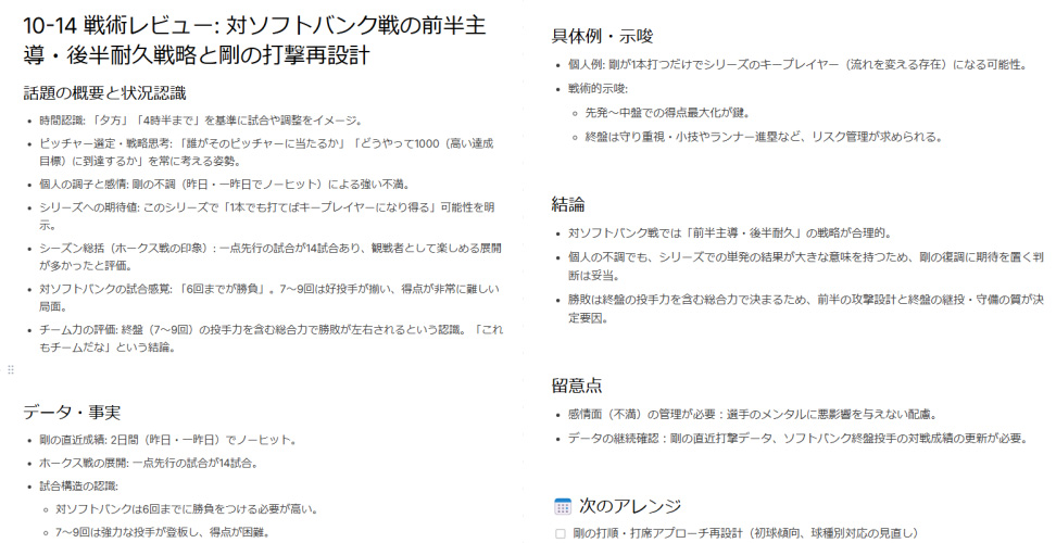 さらに要約の機能は以下の通りに。この分量のインタビューからここまで理路整然と要約されて出てくるのは驚きだ。新庄監督もここまで意図して発言していないと思うが(笑)。