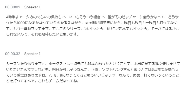 試しに、CSパリーグファイナルステージ前日の日本ハム・新庄剛志監督のインタビューを録音してみた。文字起こしの部分では、考えが「場合」、線が「1000」、内野安打が「何ヤンダ」、キーマンが「キーパ」といくつか誤りがあったが、9割近くが正しく文字を起こしていた。