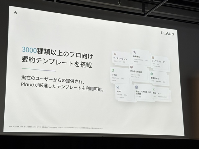 現段階では、医療(SOAP形式)、コンサル、授業など3000種類以上の業界別テンプレートにアクセスすることができます。これを使うことによってプロフェッショナルな仕事をされている方々が、最適なものをピックアップして利用いただけます」(PLAUD株式会社 セールスディレクター 鈴木直幸氏)