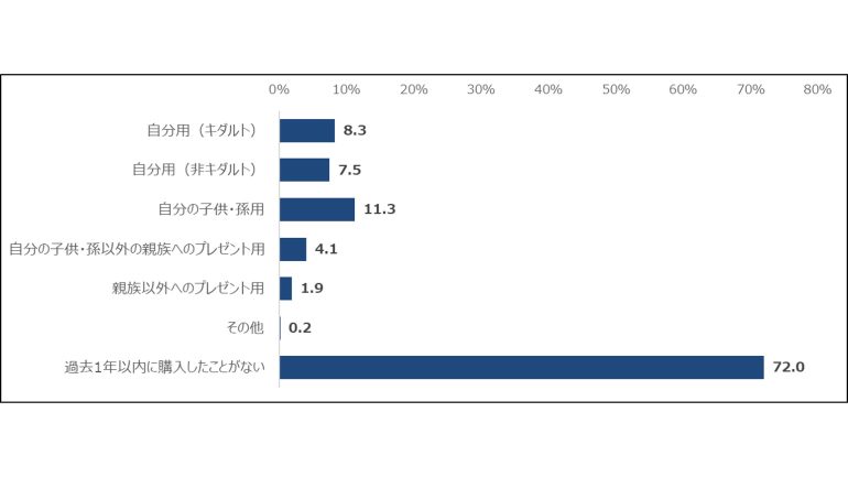 また、本調査における玩具を購入していない層(72.0%)についても、ライフステージの変化等で玩具商材とのタッチポイントが増えることで、キダルト市場はさらなる拡大の可能性が見込まれる。