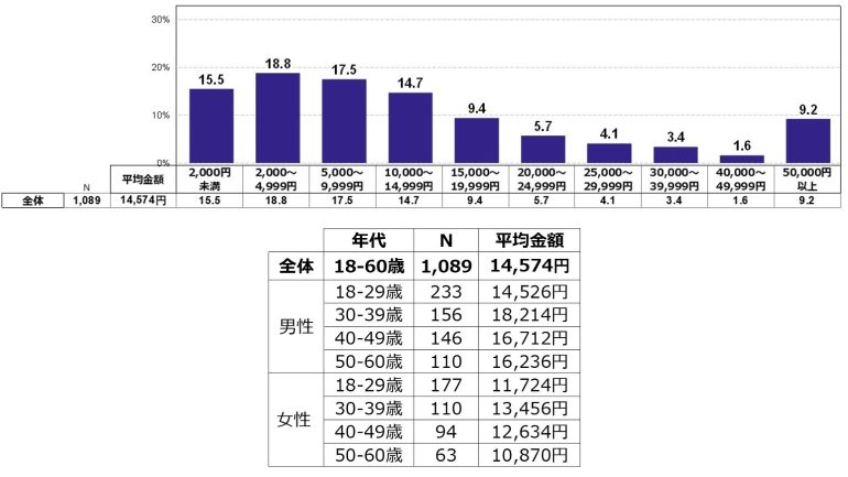 キダルト全体の年間平均購入金額は「1万4574円」であり、性年代別で比較すると、平均金額が最も高いのは「男性30~39歳(1万8214円)」だった。また、どの年代でも女性よりも男性の方が平均金額が高い傾向がみられた。