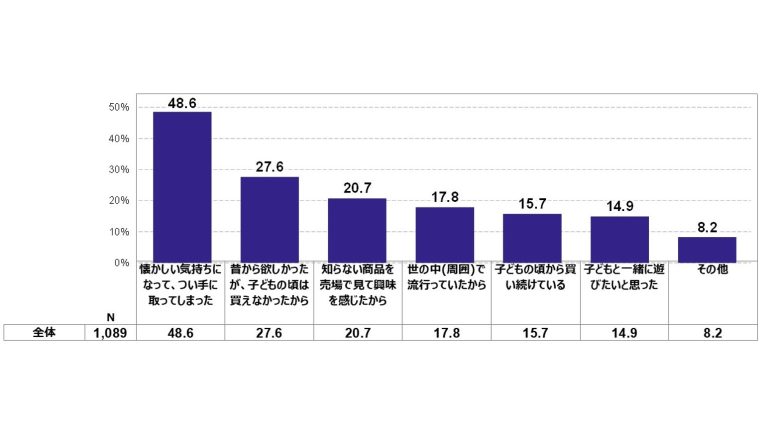 玩具購入の動機について調査したところ、最も多かったのは「懐かしい気持ちになって、つい手に取ってしまった(48.6%)」で、全体の約半数を占めた。