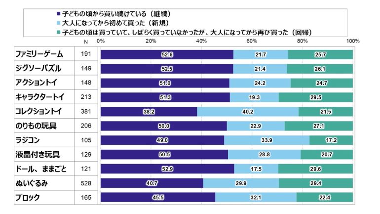 また、「キャラクタートイ」「ドール、ままごと」「ぬいぐるみ」では、「子どもの頃は買っていて、しばらく買っていなかったが、大人になってから再び買った(回帰)」層が約3割という結果も得られた。