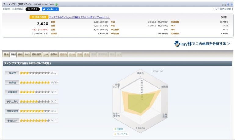 例えば、ジーテクト(5970)では、高利回り(4.46%)、割安性スコアが高い(星10個中10個)、財務健全性スコアが高い(星10個中8個)という条件を満たしています。配当利回りも近年増配傾向にあります。