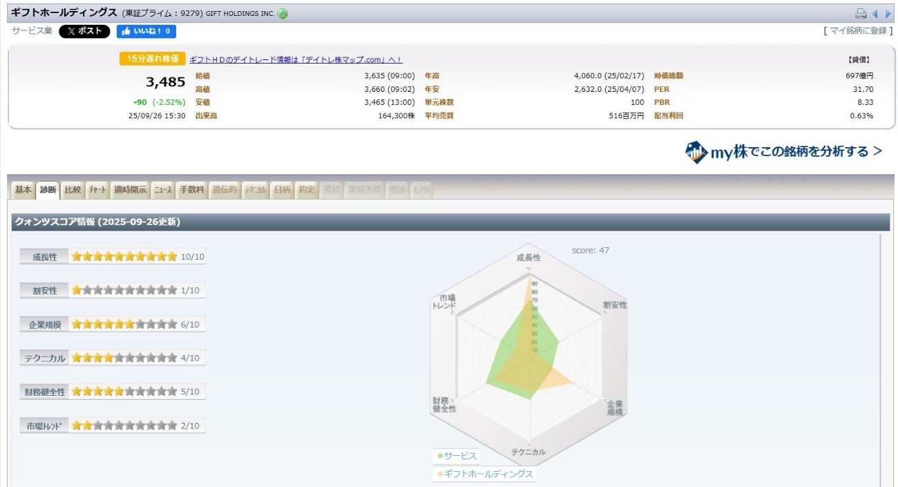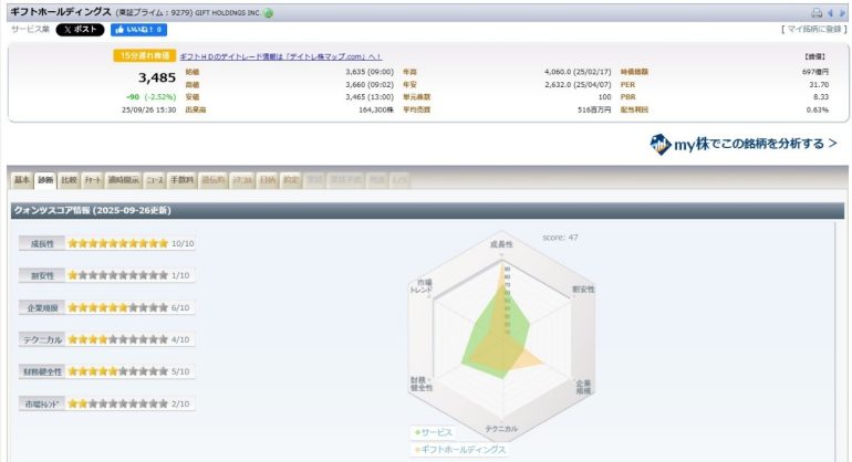 ギフトホールディングスも成長性が星10個中10個ですね。ただ、もう長いこと株価が上昇した後なので上昇の勢いは少し収まっているようで、テクニカルのスコアはそれぞれ今一つです。