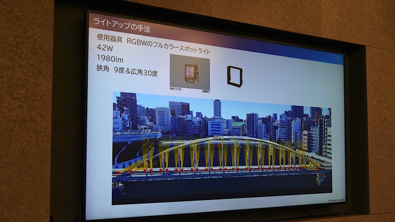 パナソニック エレクトリックワークス社の先崎さんは、「隅田川橋梁の周辺は温かみのある電球色の光が多く、ライトアップは、その雰囲気に調和した形を考えて電球色をベースにし、川の流れと同じように光に動きを出すことで、周囲との調和を目指しました」と言います。