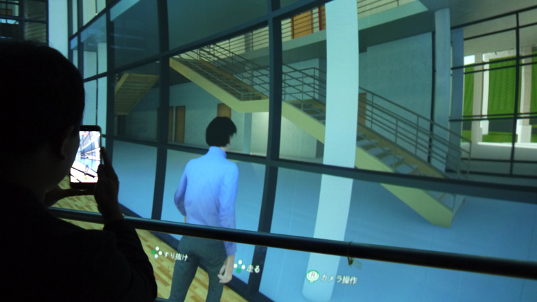 また、汐留サイバードームでは、3D映像を流して人物を動かして、実際に建物などを移動しているような体験が可能です。