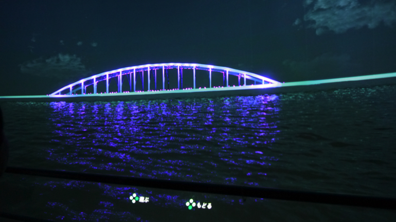 以下は、汐留サイバードームにライトニングフローで生成した、隅田川橋梁のライトアップシミュレーション映像を映したところです。