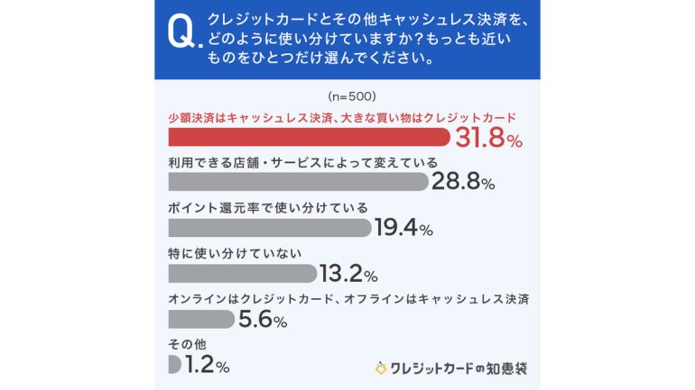 そこでクレジットカードの知恵袋は、事前調査で「クレジットカードとその他のキャッシュレス決済どちらも利用している」と回答した全国の男女500名を対象に「クレジットカードとその他キャッシュレス決済の使い分け」についてのアンケートをおこなった。