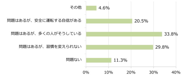 過去6か月間に自転車で「ながらスマホ」運転をしたことがあるか質問すると、15.1%がしたことがあり、そのうちの11.3%はそれが「問題ない」と回答した。1割以上が危険な「ながらスマホ」運転に問題を感じていなかった。性別・年令別では、「ながらスマホ」運転をした回答者は40代男性がもっとも多かった。