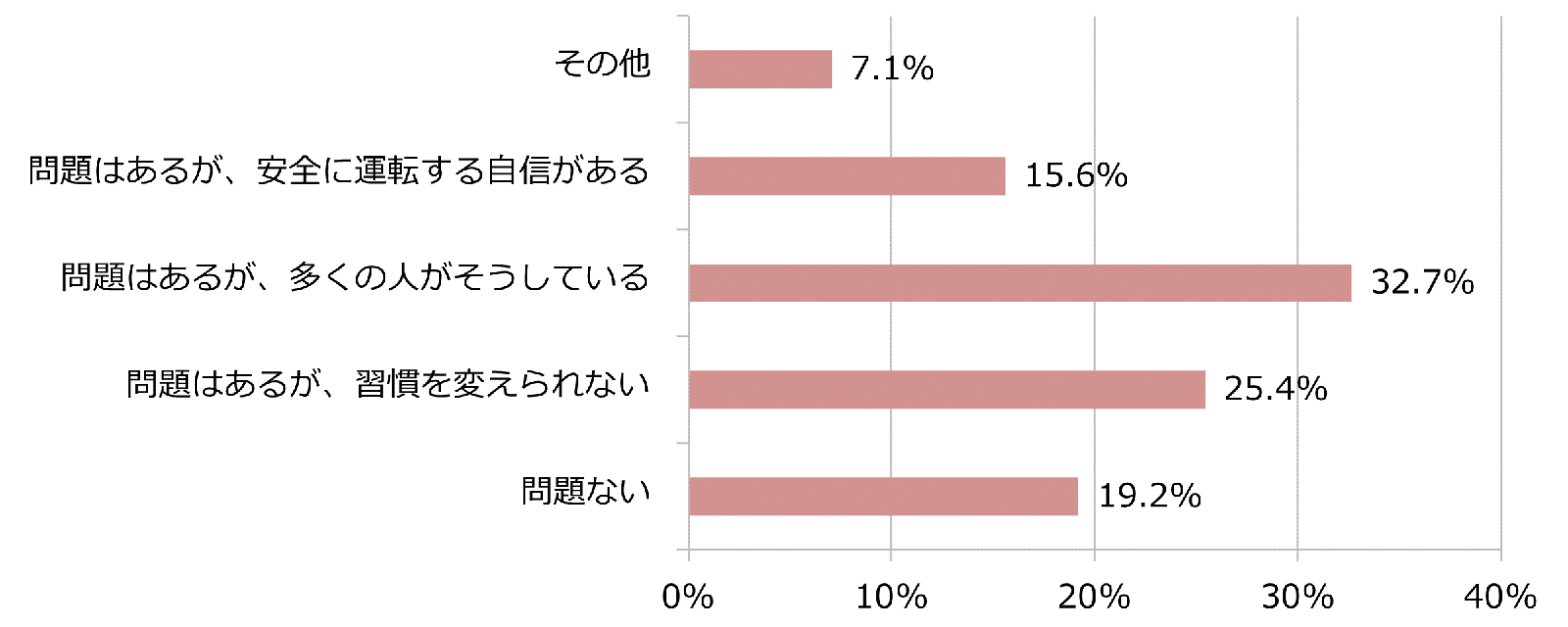 過去6か月間に自転車で「ながらスマホ」運転をしたことがあるか質問すると、15.1%がしたことがあり、そのうちの11.3%はそれが「問題ない」と回答した。1割以上が危険な「ながらスマホ」運転に問題を感じていなかった。性別・年令別では、「ながらスマホ」運転をした回答者は40代男性がもっとも多かった。