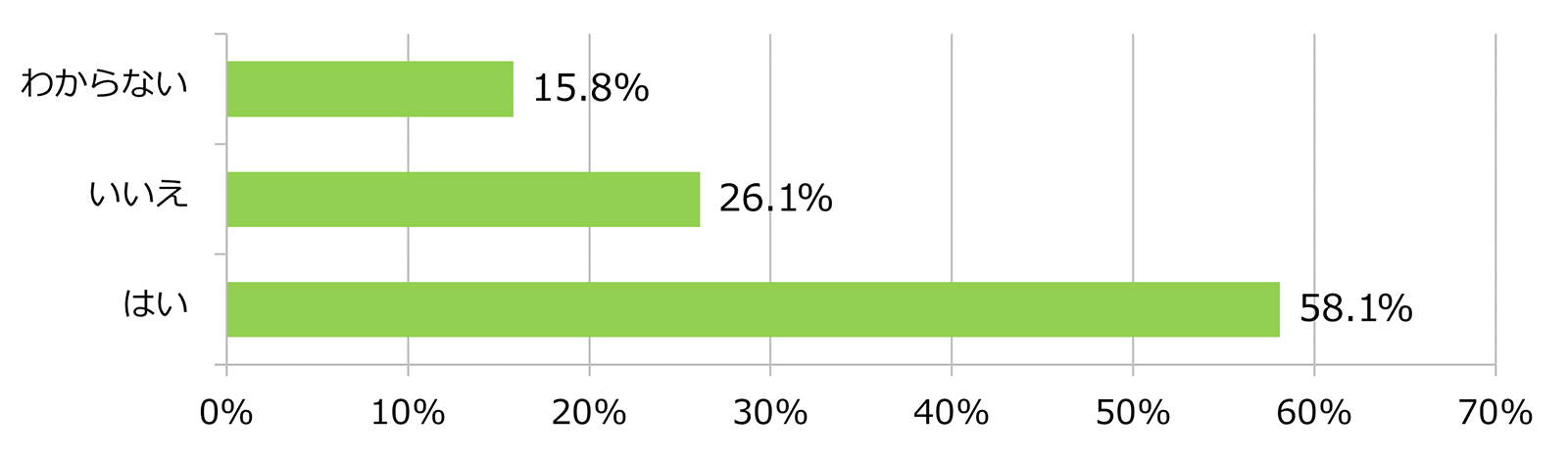 回答者の自転車損害賠償保険についての認識では、58.1%が加入していると回答した一方で、26.1%はまだ加入していなかった。さらに15.8%がわからないと回答している。約6割は保険に加入していたが、自転車の事故やトラブルがニュースになることも増えており、今後はこの数字を伸ばしていく必要があるだろう。