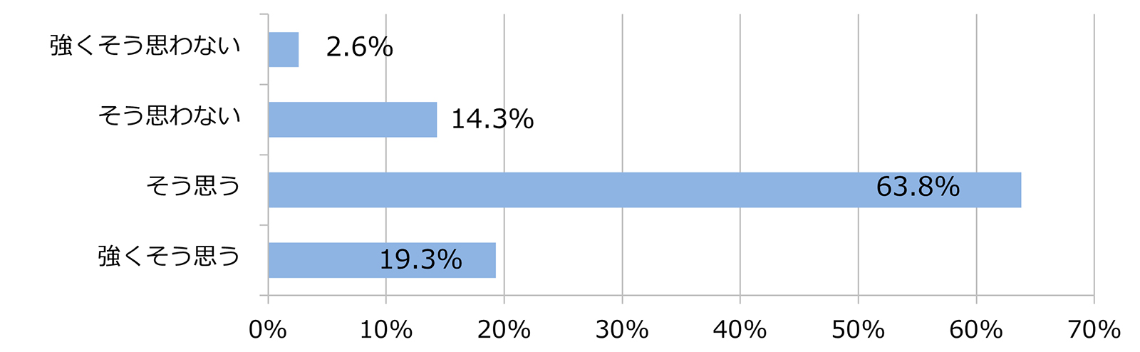周囲と比較して交通ルールを守って自転車の安全運転ができているかという質問では、「強くそう思う」と「そう思う」を合わせると83.1%という高い割合になった。ちなみに「強くそう思わない」という回答は2.6%で、自転車の利用者のほとんどは安全運転していると思っていた。