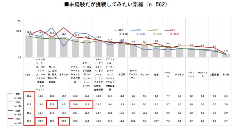 未経験だが挑戦してみたい楽器についての質問では、「ウクレレ」、「バイオリン、チェロ、コントラバス、ハープなどの弦楽器」、「琴、尺八、三味線、和太鼓などの和楽器」がトップ3だった。上位3位はほとんど差がなく、4位の「オカリナ」も15.7%と僅差だった。「ウクレレ」は、どの年代も「未経験だが挑戦してみたい」と回答した人の割合が高く、「フラダンスとの兼ね合い」や「小さくて気軽に始められる」が人気の理由として挙がった。50代から高い支持を集めたのは「琴、尺八、三味線、和太鼓などの和楽器」、「ドラム、パーカッションなどの打楽器」、「ギター、ベースなどの弦楽器」だった。70代は「バイオリン、チェロ、コントラバス、ハープなどの弦楽器」と「オカリナ」の人気が高く、両方とも20%を超えていた。未経験だが挑戦したい楽器の変わり種としては、「パリージョ」(59歳)、「二胡」(62歳)、「口笛」(67歳)などを挙げる人もいた。
