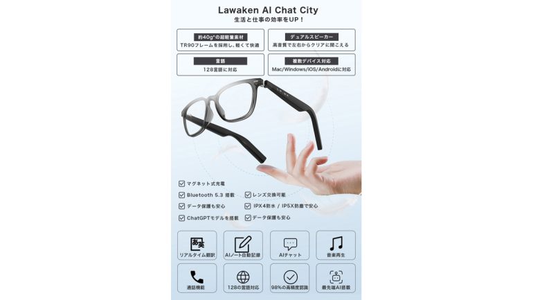 システム開発や製品の企画・開発を手掛けるNEXT(ネクスト)は、最先端AIを搭載した次世代スマートグラス『LAWAKEN AI Chat City』をクラウドファンディングプラットフォーム『GREEN FUNDING』で2025年10月中旬より販売開始することを発表した。グローバル志向のビジネスパーソンやガジェット好きに向けて、日常と仕事をアップデートする新しい体験を提供していく製品になるという。