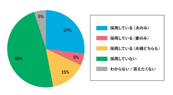 夫婦間においてお小遣い制度を採用しているか否かを尋ねたところ、夫のみ採用しているが27%で最多となり、妻のみ採用(5%)、夫婦どちらも採用(15%)を合わせると、47%の夫婦がお小遣い制度を採用しているとわかった。