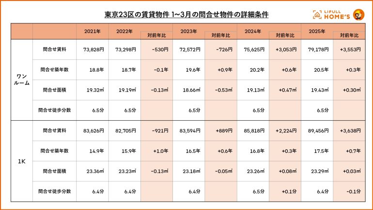 同期間にLIFULL HOME’Sへ掲載された物件のうち、問い合わせに至った物件の賃料・築年・専有面積・駅徒歩分数を集計。賃料・築年・面積は変動がある一方、駅徒歩数はほぼ横ばい。