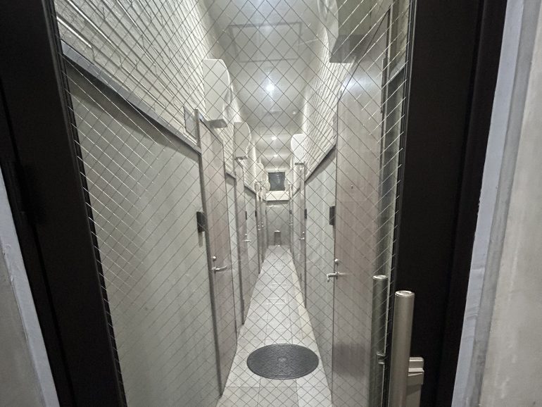 見せてもらったのはモデルルーム。テーブルと椅子が置かれ、両側の壁に棚が並ぶ。残る床はおよそ2メートル四方弱。ひとり暮らしなら身支度や家事は回るが、床に寝転がる余地はない。