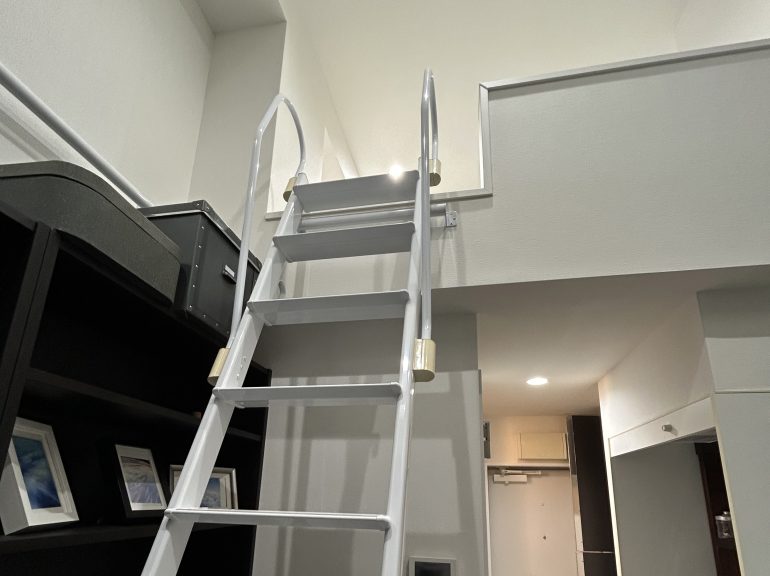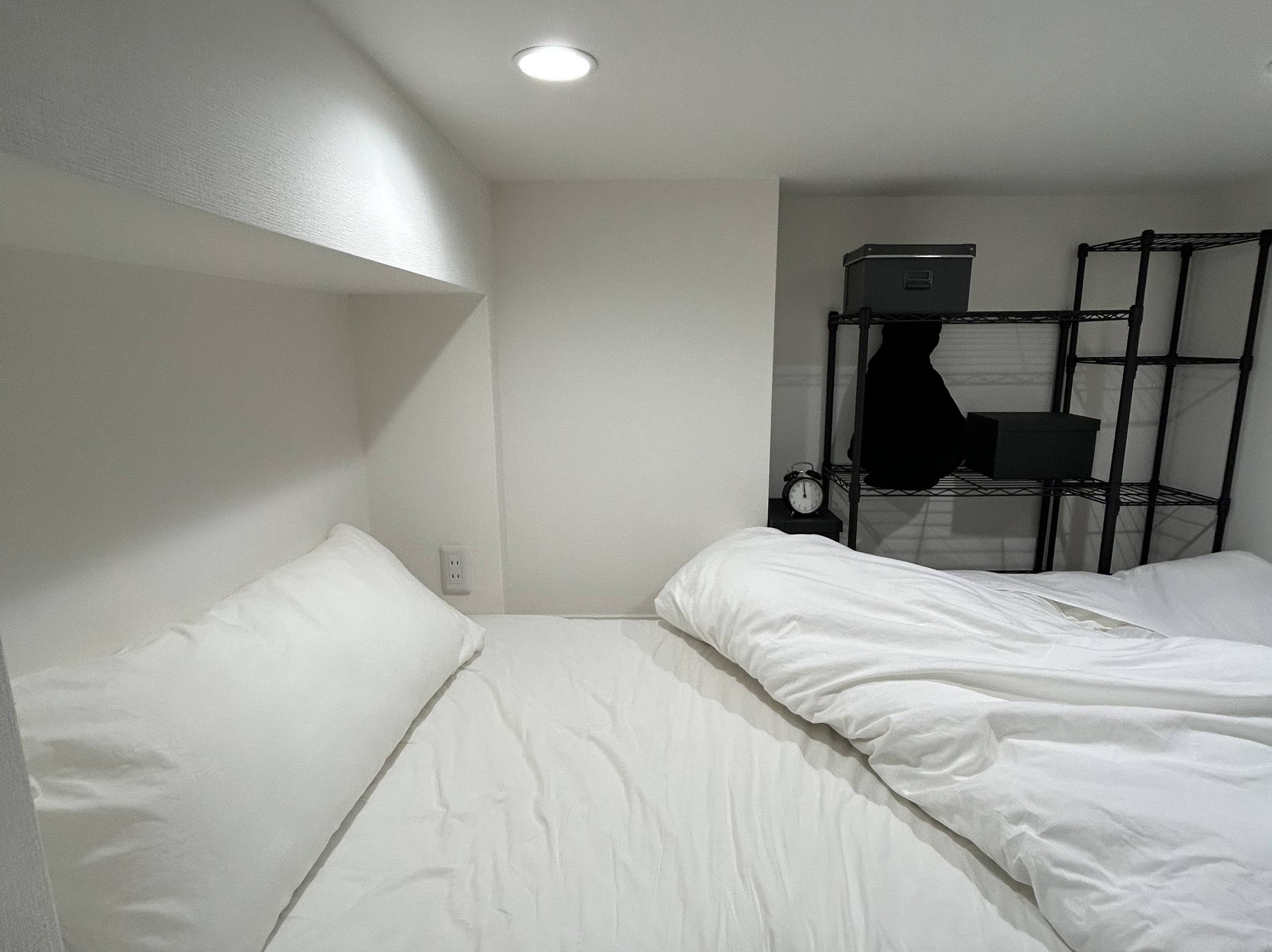 右奥のはしごを上がるとロフト。ダブルマットレスと小さな棚が置ける程度の面積で、睡眠と収納に機能を絞った〝寝台〟として割り切っている。