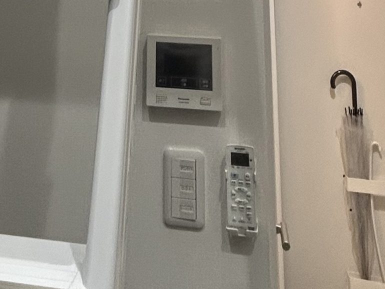 室内は設備と操作を壁面に集約している。コンセントとテレビ端子は部屋の右下1か所にまとめ、エアコンのリモコン、照明スイッチ、来客モニターも部屋の右側の壁にまとまって配置。鏡は姿見サイズを壁に埋め込み、物干しは室内物干しワイヤーで可動式にするなど、床を塞がない工夫が目立つ。