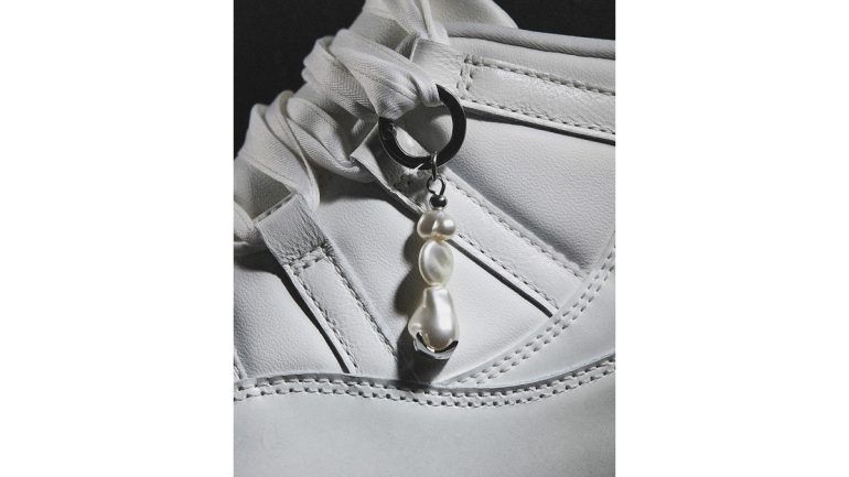 幅広のリボンレースと淡水パールのキーチェーンがさらに個性を加え、大胆に注目を集めるだろう。