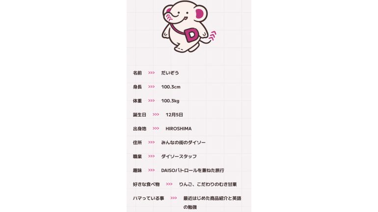ダイソーのブランドカラーであるピンクをまとったゾウのキャラクターが今年9月に誕生した。これは、ダイソーを手がける大創産業の初めての公式キャラクターだ。