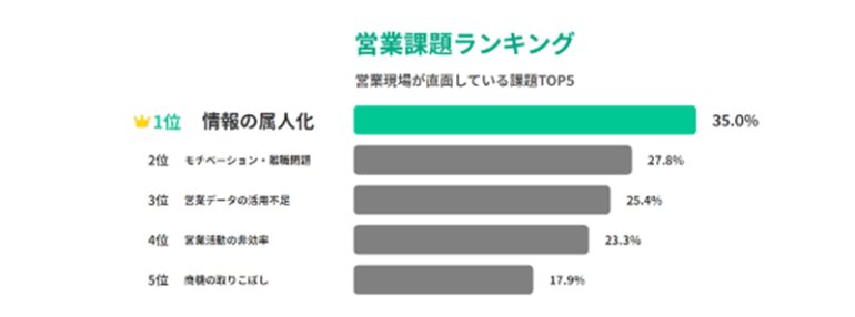 「あなたが営業をする上で、または営業組織をマネジメントする上で感じる課題は何ですか?」という質問では、「情報の属人化・ブラックボックス化」(35.0%)がもっとも多い回答だった。この課題は単独で存在しているのではなく、営業活動の非効率、商機の取りこぼし、顧客関係の断絶、品質管理の困難さ、社員モチベーションの低下や離職問題などさまざまな派生的課題を生み出しているという。「情報の属人化・ブラックボックス化」は、表面的な数値以上に営業課題の根本原因になっているといえるだろう。