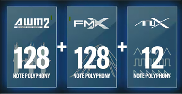 まず肝心要の音源については3種類を搭載。リアルなサンプリング音源「AWM2」、ヤマハFM音源の伝統を継ぐ「FM-X」、そして「MODX+」にはなかったアナログモデリング音源が「AN-X」。つまり生楽器のリアルさを求めるなら「AWM2」、デジタルシンセらしいキラキラした個性なら「FM-X」、往年のアナログシンセサウンドを活かしたいなら「AN-X」と、キーボーディストは3つの武器を手に入れたことになる。