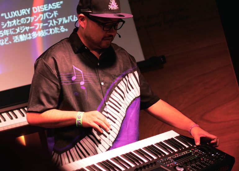発表会場に駆け付け、濃密なデモ演奏を披露してくれたキーボーディストの「Gakushi」さん(画像:下)によれば、
