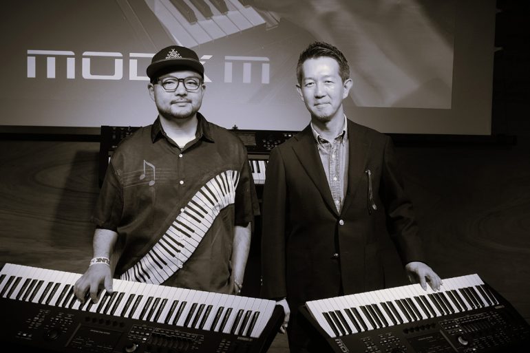 Gakushiさんと(株)ヤマハミュージックジャパンLM事業戦略部部長の冨岡雅佳さんwith「MODX M」でハイポーズ!