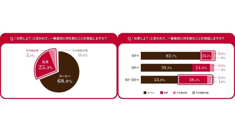 株式会社ゴンチャジャパンの調査によると、「お茶しよ?」という誘いに対して思い浮かべる飲み物は、全体では約7割(68.9%)が「コーヒー」であるのに対し、「お茶」を挙げた人は約3割(30.4%)にとどまった。しかし、年代別に見ると傾向は異なる。40代では82.7%が「コーヒー」を想起したのに対し、29歳以下では53.8%にとどまり、若い世代ほど「お茶」を連想する割合が高いという。