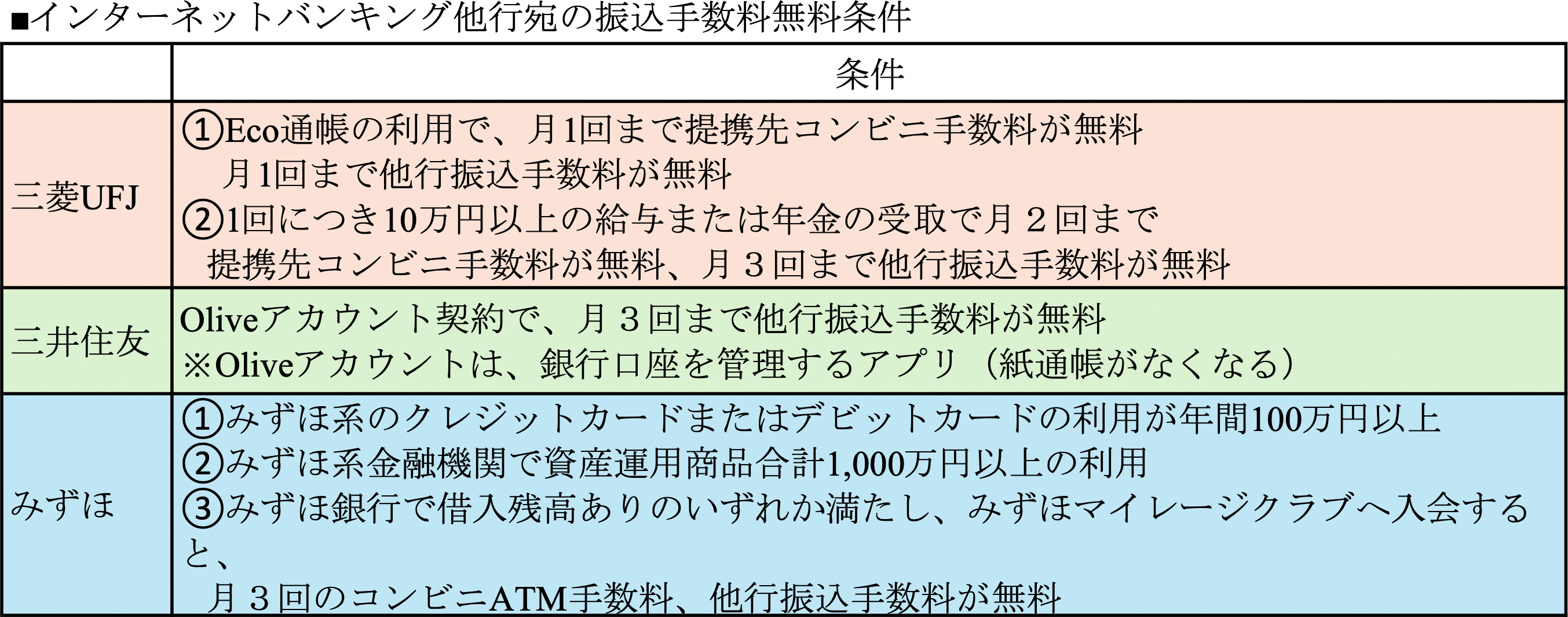 もともと他行宛振込手数料が110円と他行に比べて安いが、みずほマイレージクラブに入会のうえ、以下3つのどれかの条件を1つ満たすと、月3回のコンビニATM手数料、他行振込手数料が無料となる。