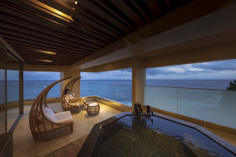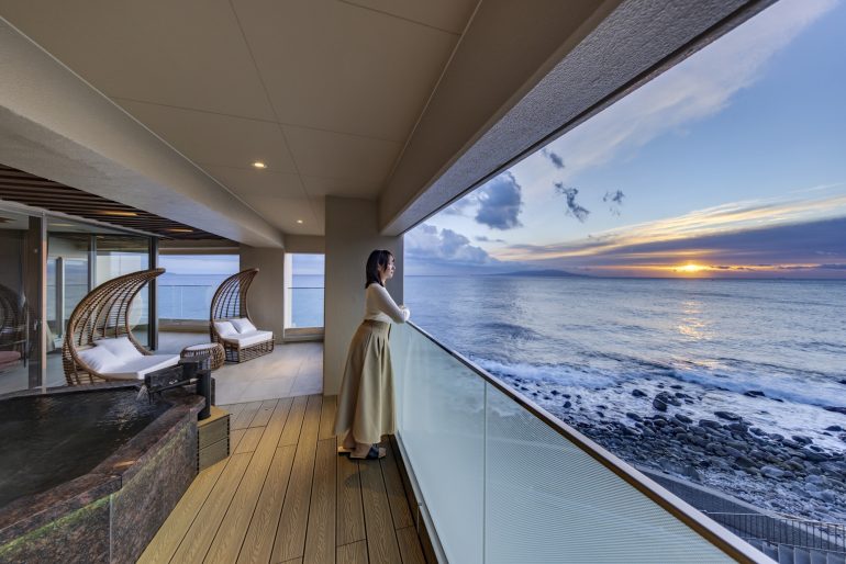 浜の湯は、伊豆七島を一望でき、現地ならではの海鮮料理と、オーシャンビューの絶景を眺めながらの温泉を堪能できる宿だ。客室5室から始まった昭和44年(1969年)以来、55年以上そのこだわりを提供し続けている。