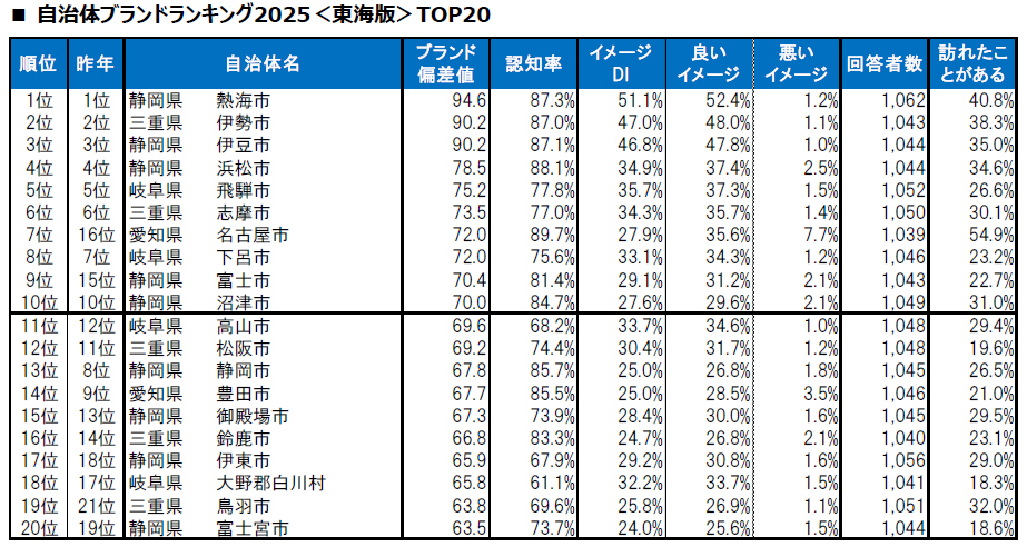 自治体ブランドランキング2025<東海版>、1位は「静岡県熱海市」