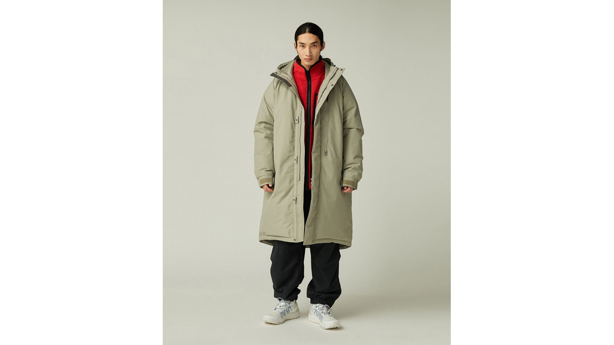 真冬のハードな環境下にも対応するダウンジャケット、ダウンコート。中に厚手のニットやミドラーを着ても余裕のあるシルエットで動きやすさも考慮した。コートの丈は膝下まであるため、ベンチコートのような使い方も可能。