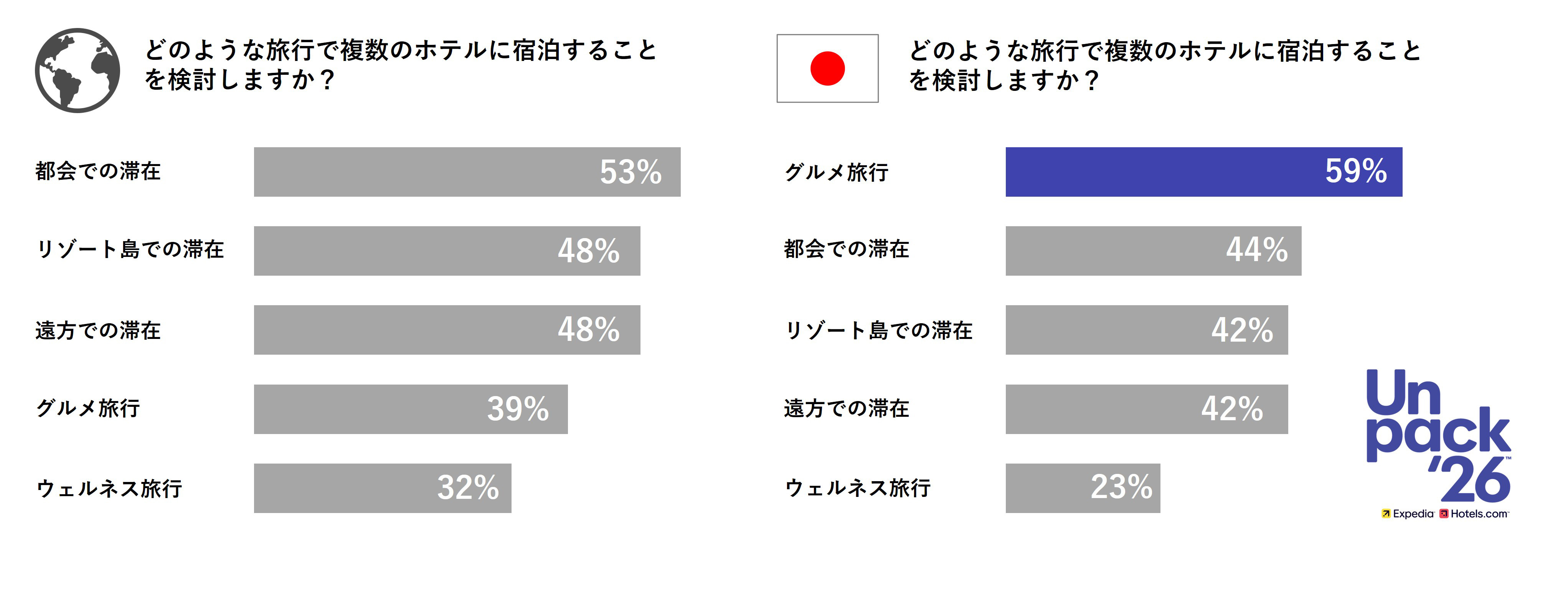 世界の旅行者の半数以上(54%)が「ひとつの旅行先で複数のホテルに宿泊したい」と回答しており、「ホテルホッピング」が新たな旅行トレンドとして注目を集めている。