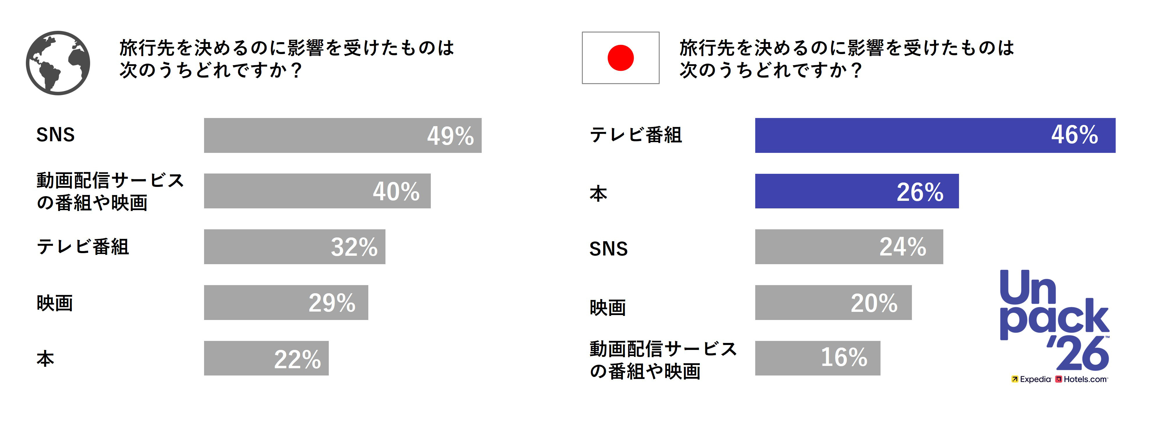 また、旅行先を決めるのに影響を受けたものについて、世界の旅行者では「SNS(49%)」が最も多く、次いで「動画配信サービスの番組や映画(40%)」が続くのに対し、日本では「テレビ番組(46%)」が最多で、次いで「本(26%)」という結果に。特に「本」と回答した割合は日本が世界で最も高い割合となった。
