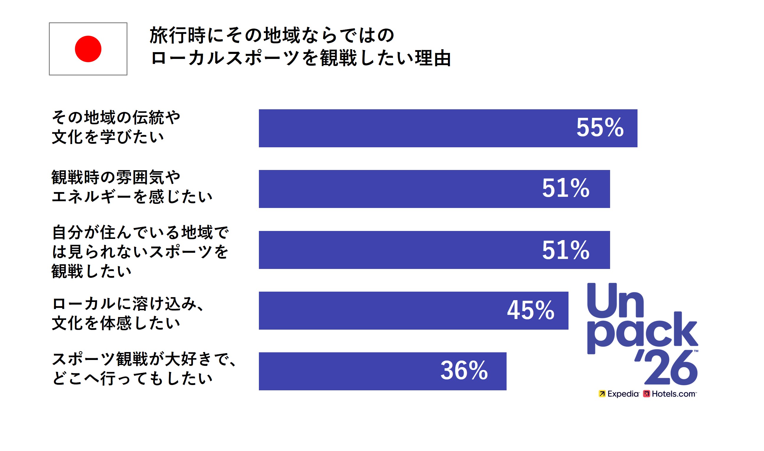 また、旅行時にその地域ならではのローカルスポーツを観戦したい理由について、日本人の旅行者は、「その地域の伝統や文化を学びたい(55%)」が最も多く、次いで「観戦時の雰囲気やエネルギーを感じたい(51%)」「自分が住んでいる地域では見られないスポーツを観戦したい(51%)」という回答が続いた。