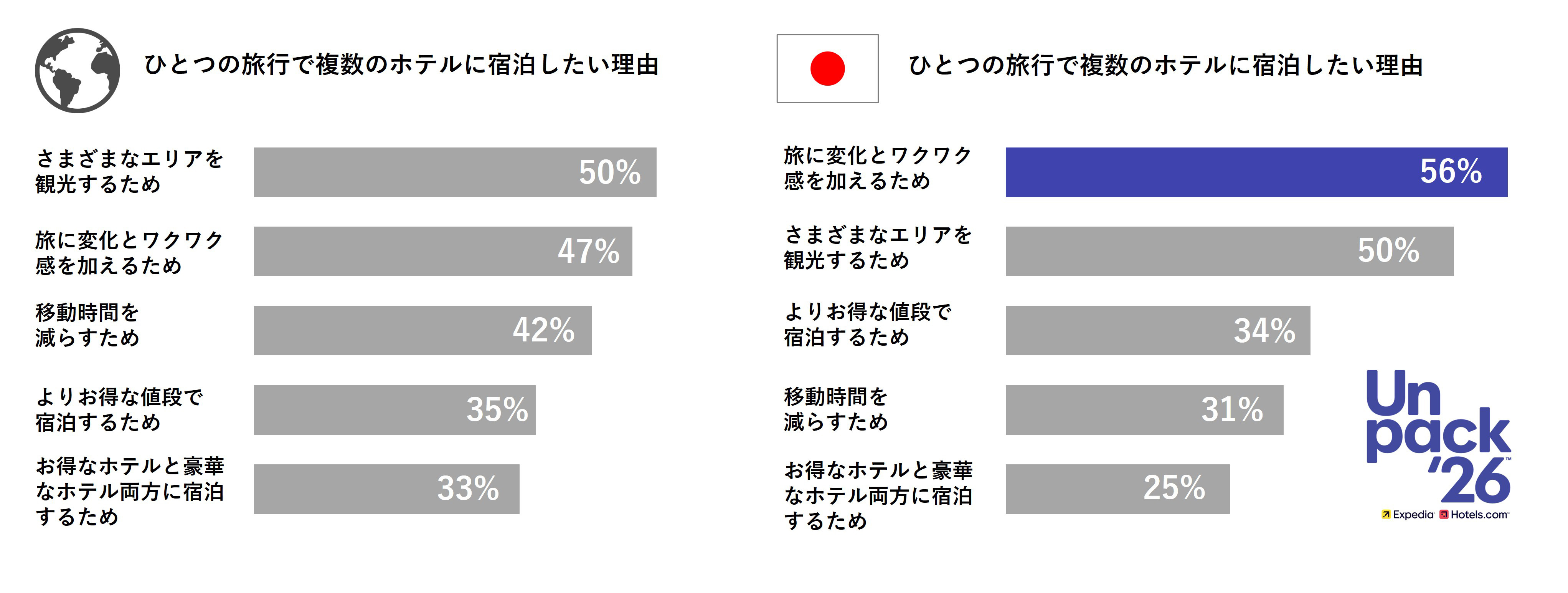 一方、日本人の回答に限定すると、半数以上(56%)の人が「旅に変化とワクワク感を加えるため」と回答し、この割合は世界で最も高い結果に。ひとつの旅行でも常に新鮮な体験や刺激を求めていることがわかる。