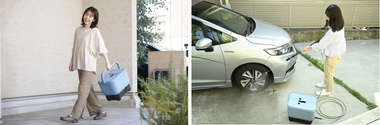 今回発売の「バッテリー対応 給水タンク式 高圧洗浄機」は、ELEINのバッテリー(別売)を使用することで、電源の確保が難しい場所でも手軽に使用することができるコードレス仕様の高圧洗浄機。大容量18L(※1)の給水タンクに水をためておけば、水道が近くにない環境であっても問題なく使用可能で、アウトドアや災害時の清掃時にも頼りになる一台だ。