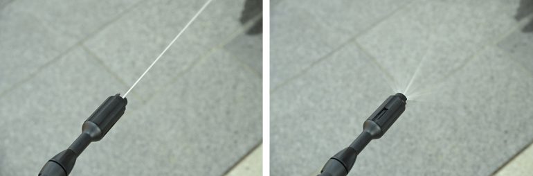 さらに、ノズルの先端を回転させるだけで水流の種類を水流の種類を「スポット」「広角」に簡単に切り替えることができるため、用途に応じた最適な洗浄も可能。加えて、「延長ランス」(※3)も付属し、手が届きにくい高い場所の汚れにもスムーズに対応できる。