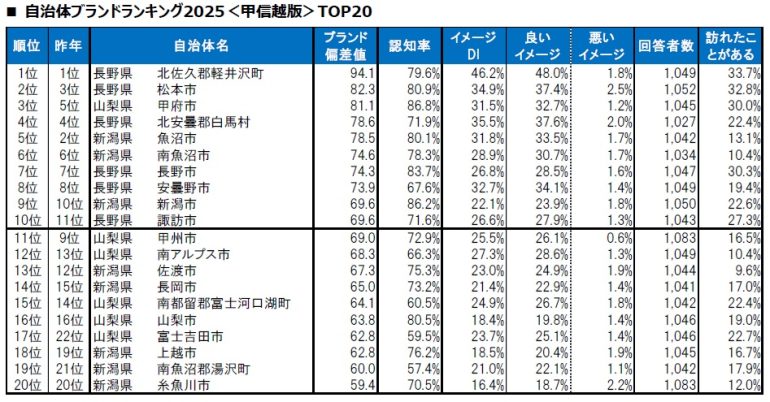 <甲信越版>の1位は、昨年に引き続き長野県・北佐久郡軽井沢町が獲得。ブランド偏差値は94.1と、2位の長野県・松本市の82.3よりも11.8ポイントも高い結果となっている。そのほか、3位には山梨県・甲府市(81.1)、4位には長野県・北安曇郡白馬村(78.6)、5位には新潟県・魚沼市(78.5)がランクイン。山梨県・甲府市は昨年の5位からランクアップしているが、新潟県・魚沼市は昨年の2位からランクダウン。長野県・北安曇郡白馬村は4位をキープしている。